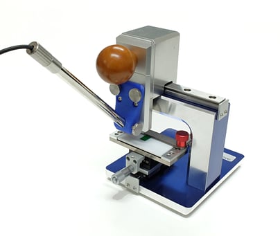 This table top cutter is equipped with a wheel shaped steel blade mounted on a sliding shuttle. To cut the sample you simply place your sample on the sample stage and pull the sliding shuttle